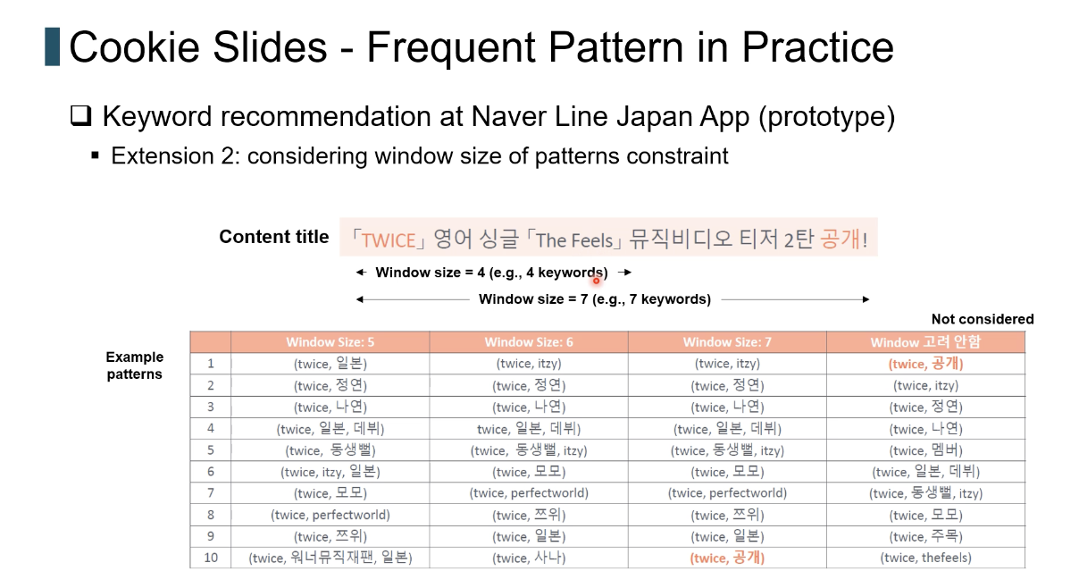 - Window size를 고려하여, 하나의 문장에서 서로 가까운 위치에 등장한 키워드들만 연관된 패턴 후보로 간주한다. 예를 들어, “twice”와 “공개”가 문장 양 끝에 있다면 그 연관성은 낮다고 보고 제외한다.