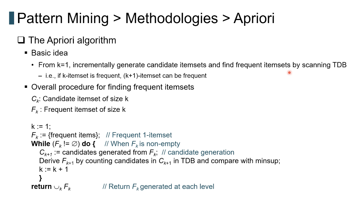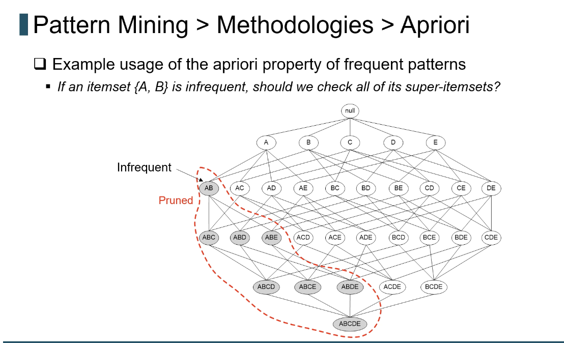 - 반대로, X가 frequent가 아니라면, X를 포함하는 어떤 Y도 frequent가 될 수 없다. 이걸 Apriori의 핵심 pruning 논리로 사용