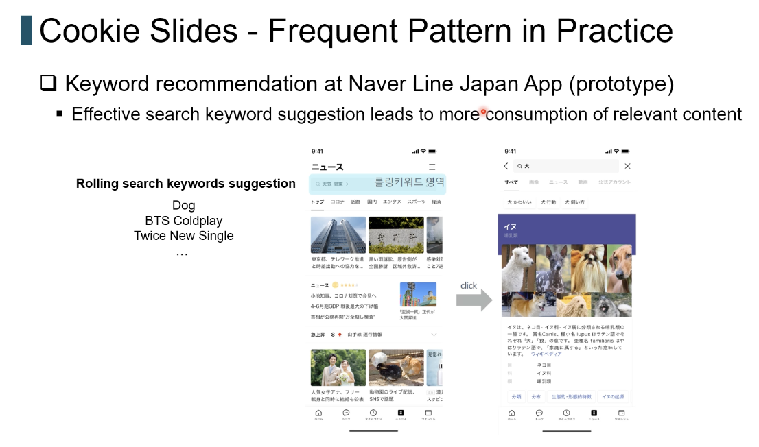 라인 재팬 앱에서의 키워드 추천 시스템은 사용자의 검색 쿼리가 부족하거나 개인정보 이슈로 인해 로그 기반 추천이 어려운 상황을 고려해, 콘텐츠 자체에 등장하는 키워드들 간의 연관 패턴을 분석하여 질의 추천을 제공하는 구조다.