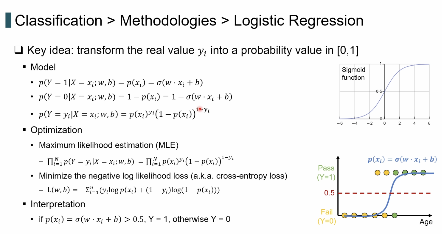 Logistic Regression은 선형결합을 확률로 변환하여 두 개 이상의 class 중 하나를 선택하도록 설계된 모델로, 이름은 regression이지만 실제로는 classification을 위한 지도학습 기법이다.
