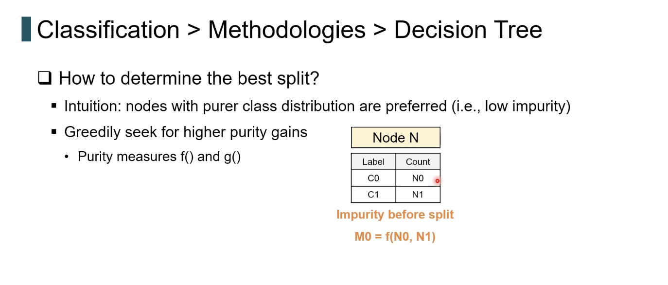 트리는 split 전후의 impurity를 비교해 가장 큰 향상이 있는 split을 선택한다. Impurity before split = M0 = f(N0, N1) = 여기서 f는 impurity 측정 함수다.
